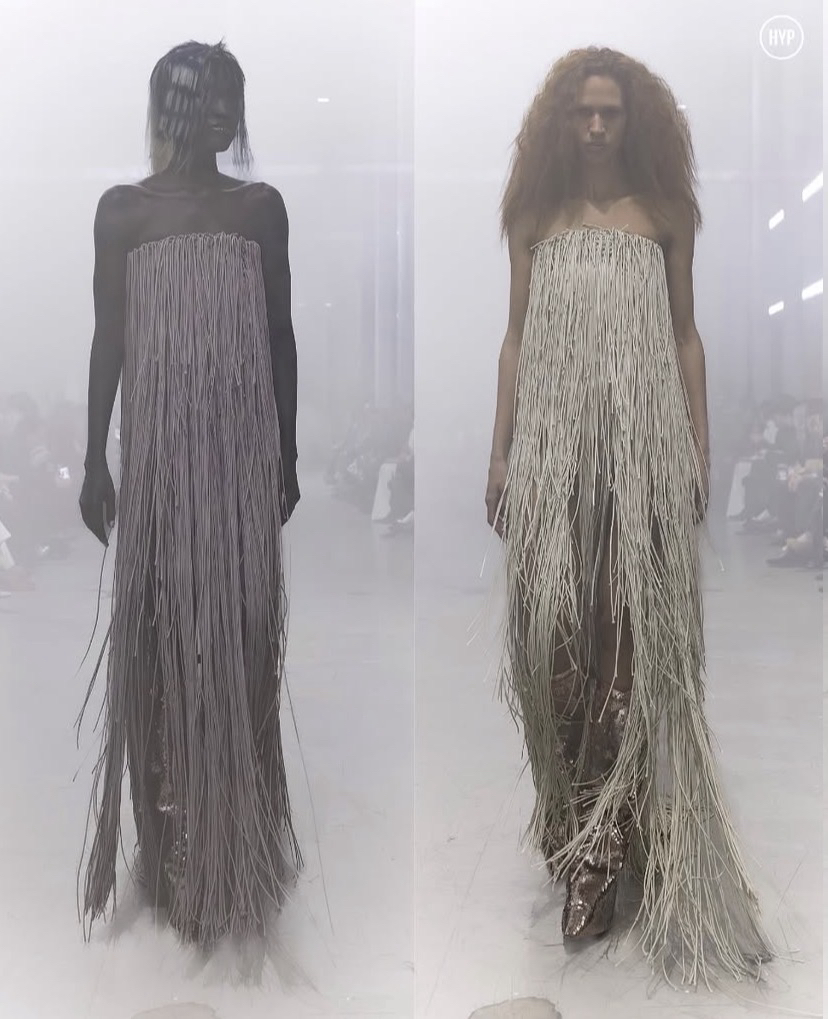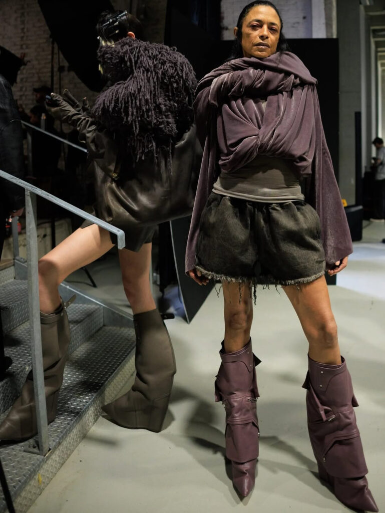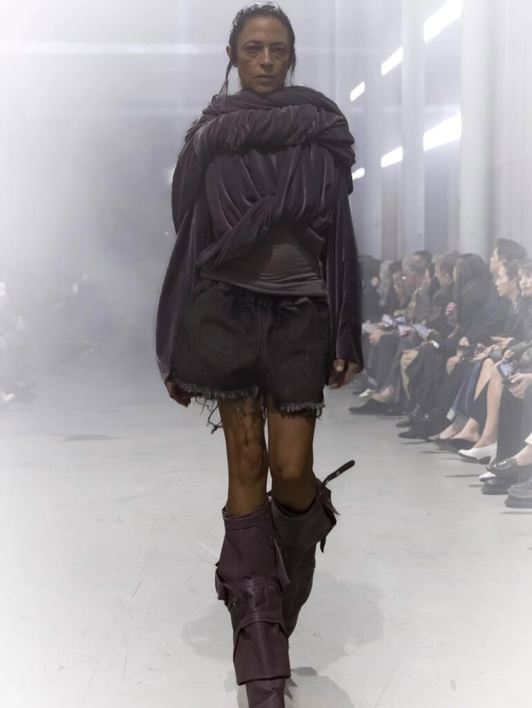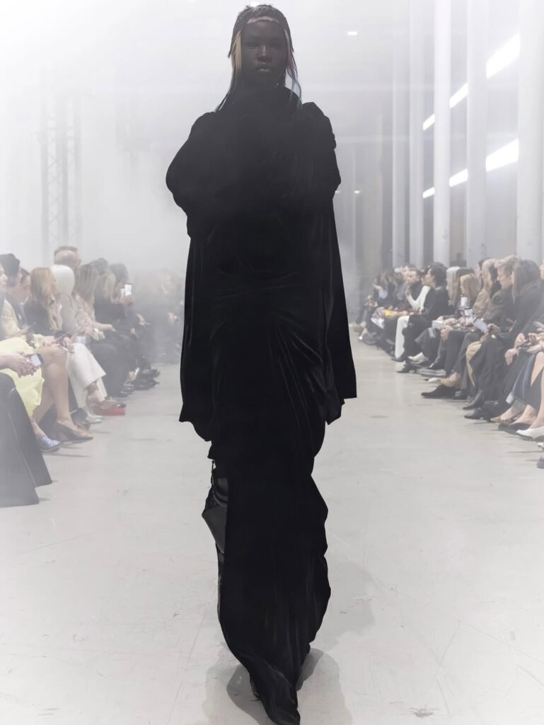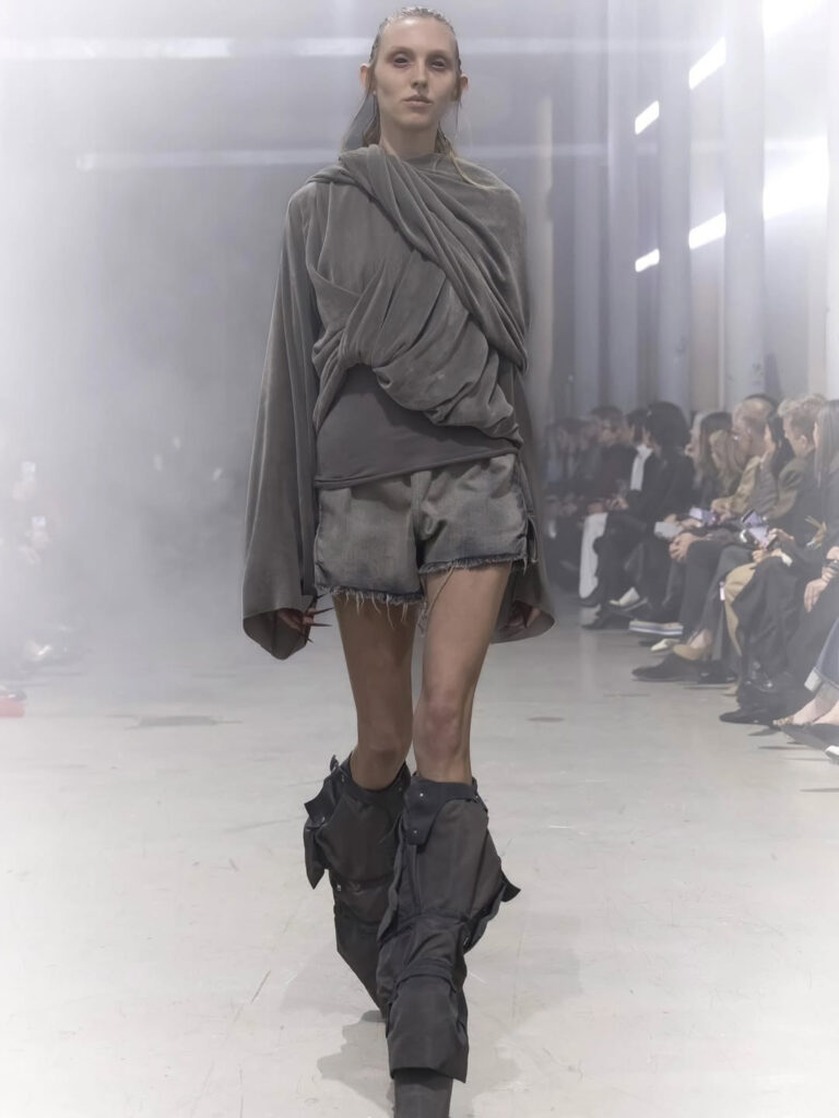 A apresentação na passarela reforçou essa atmosfera. As modelos surgiram em fila, com passos firmes, cerimoniais, vestindo botas altas e plataformas pesadas que amplificaram a presença das silhuetas. O efeito coletivo lembrava uma espécie de procissão futurista: figuras alongadas, envoltas em volumes dramáticos, atravessando o espaço como personagens de um ritual. Nada mais Rick Owens que esse cenário distópico.