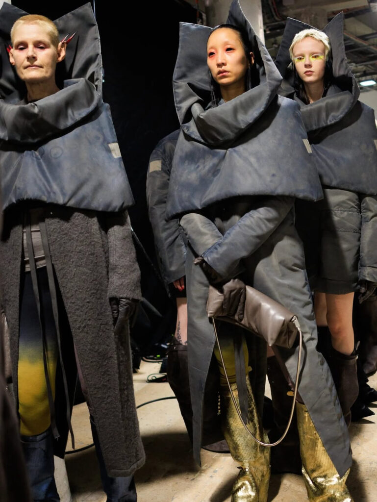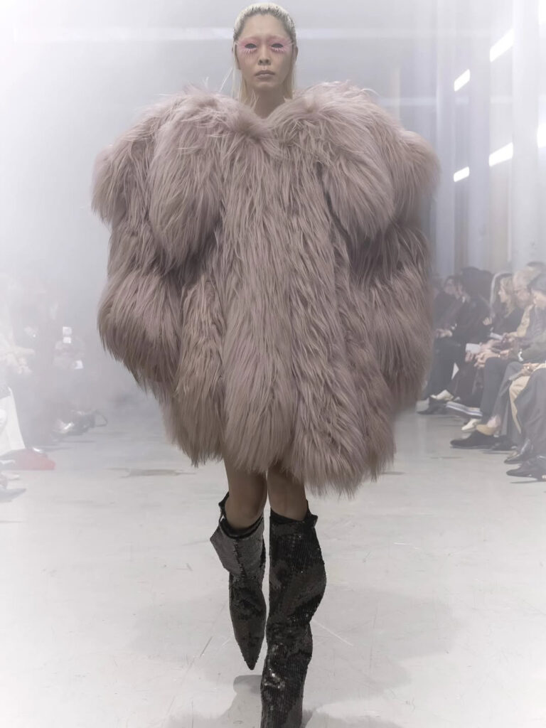 Outro destaque são os casacos monumentais, muitas vezes confeccionados em materiais pesados, como lã espessa ou superfícies felpudas que lembram pele. A modelagem amplia drasticamente os ombros e o volume do tronco, fazendo com que as peças quase engulam o corpo das modelos. Sendo uma espécie de armadura têxtil, reforçando o imaginário pós-apocalíptico que permeia o universo da marca.