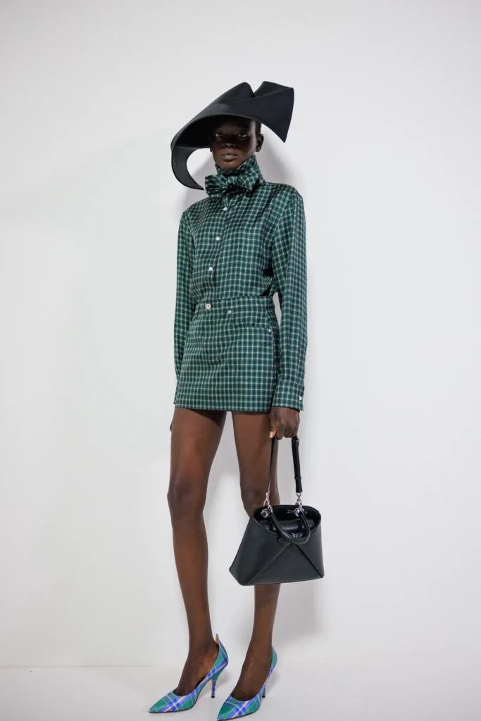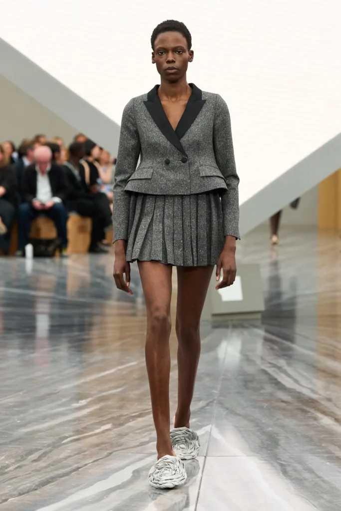 O designer demonstrou maestria ao desconstruir alguns dos arquétipos mais icônicos da maison, como o Bar Jacket, elemento central do New Look de Christian Dior, junto de mini saias plissadas, criando uma reinterpretação jovial e contemporânea do clássico.