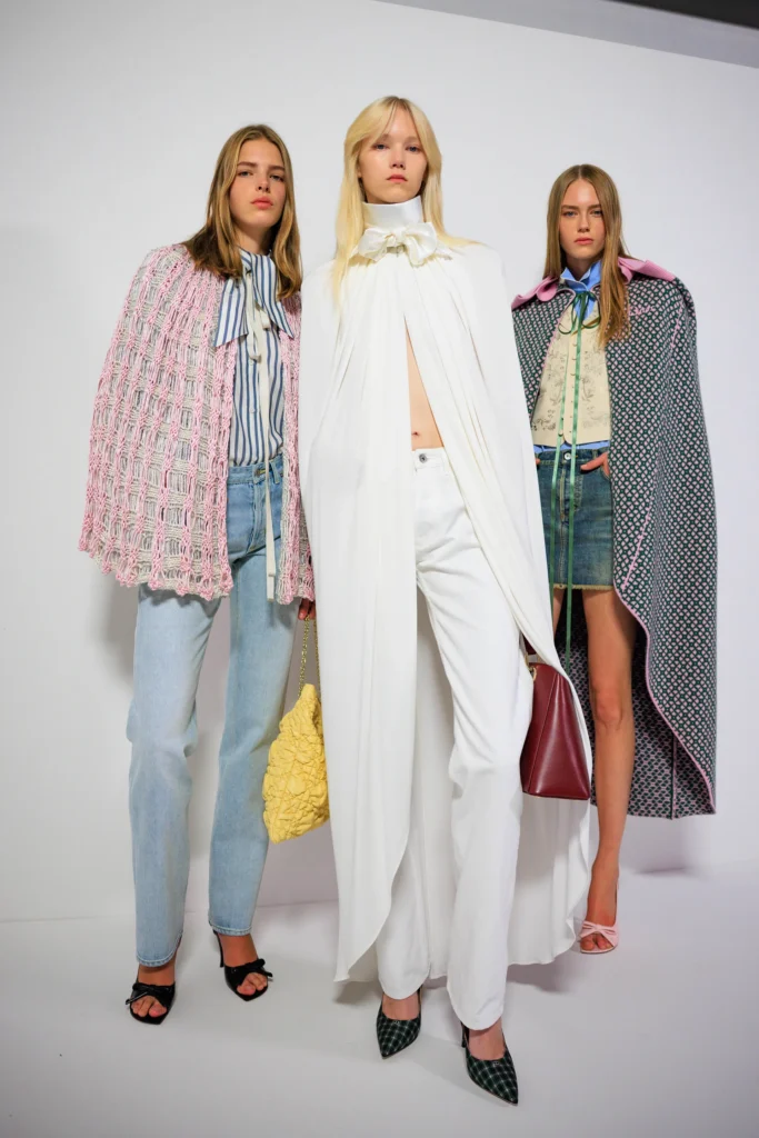Esta abordagem inovadora estendeu-se por toda a coleção: laços foram posicionados de forma irreverente, aparecendo em camisas de smoking ou junto de minissaias.