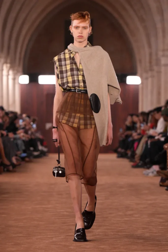 O desfile abriu com blazers oversized em couro queimado, usados sobre calças de corte reto, num contraste entre poder e casualidade. Logo em seguida, surgiram vestidos de renda desconstruídos, quase desmanchando-se no corpo, revelando uma sensualidade crua.