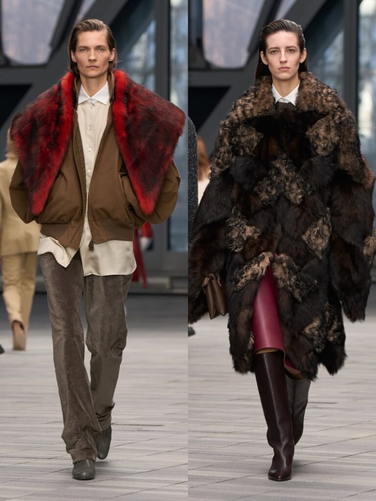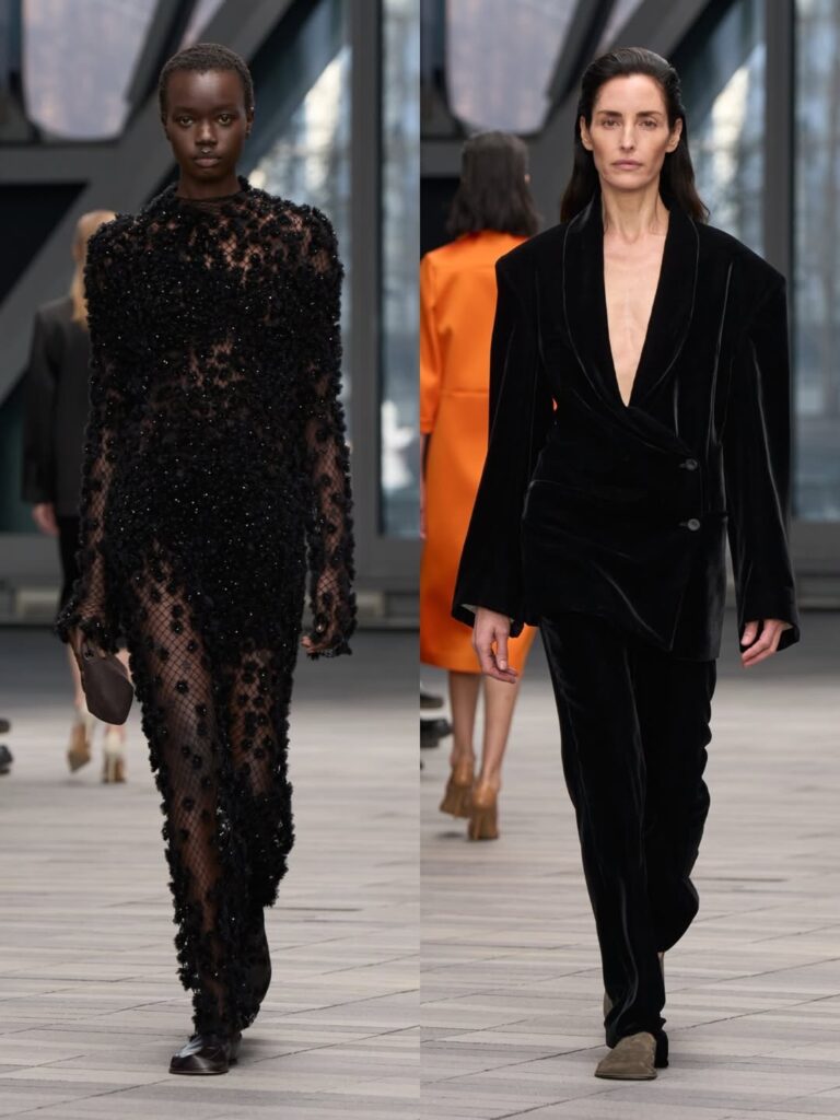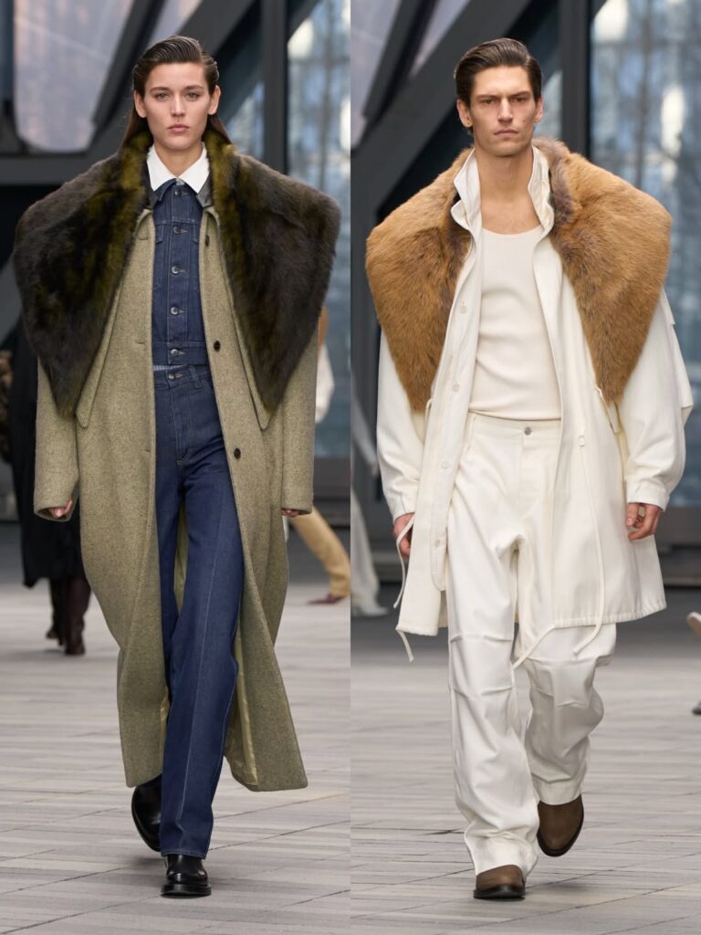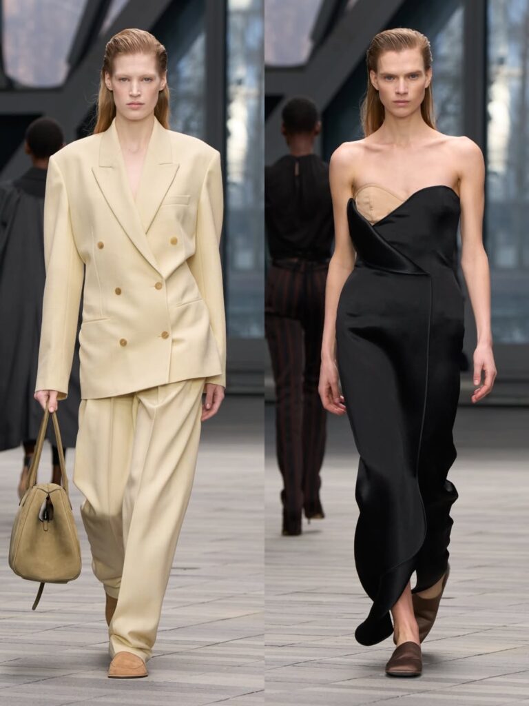 Conjuntos com ombros marcados e casacos longos criaram silhuetas fortes, mas ao mesmo tempo elegantes. Cada look parecia pensado para dialogar com diferentes momentos da vida urbana, do trabalho aos eventos noturnos.