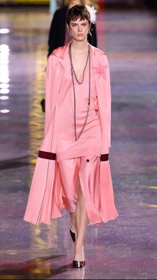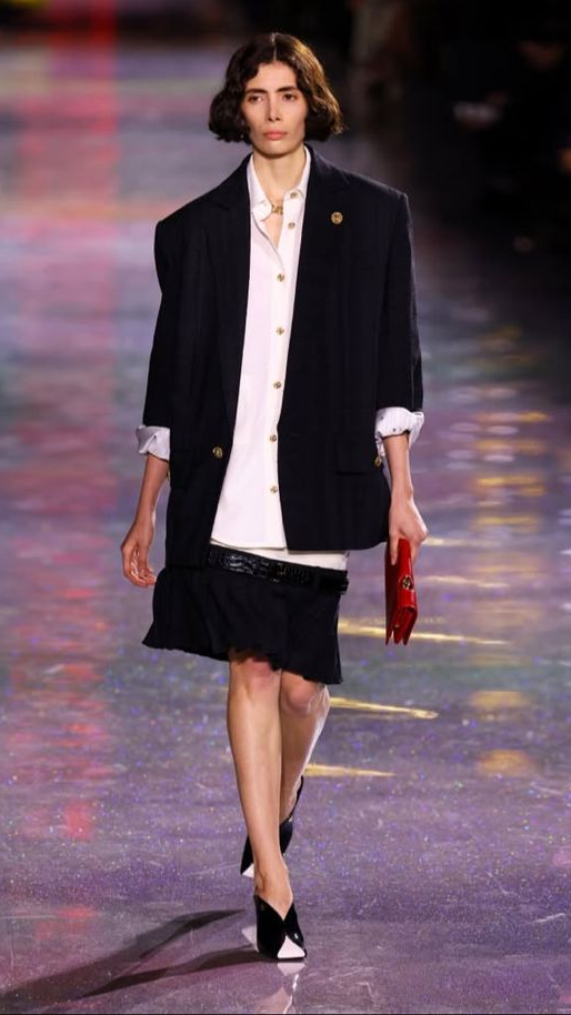 Fato é que o cós despencou na Chanel, e a silhueta dos anos 20’s é a aposta de Blazy para esse inverno. Ela vem em vestidos adornados com cintos que demarcam a cintura — alguns com saias plissadas semelhantes às da Miu Miu de 2022 — ou com botões que agregam atemporalidade ao visual.
