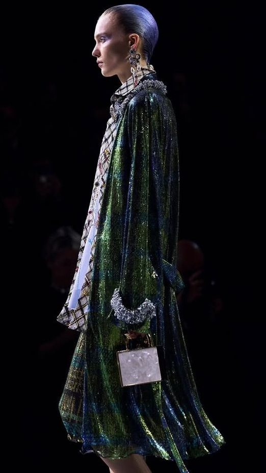 O desfile acontece em um Grand Palais cujas passarelas brilhantes e etéreas contrastam com os guindastes coloridos que as rodeiam. E essa parece ser a proposta da coleção: o contraste e o paradoxal.