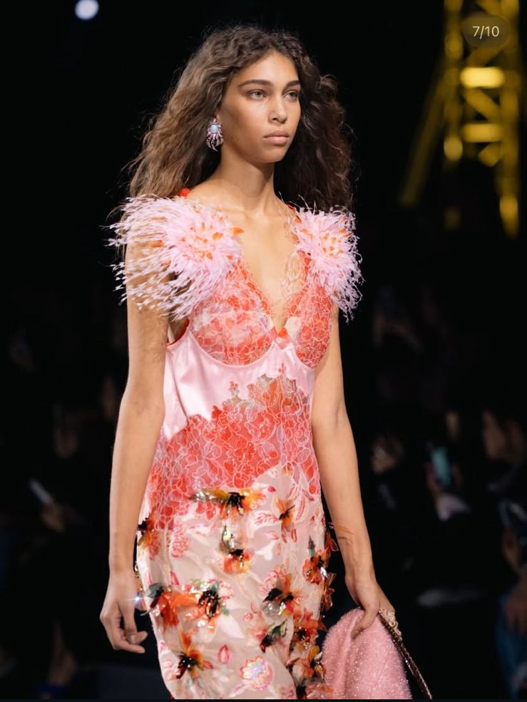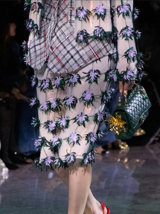 Portanto, vimos tweeds xadrez com renda fina floral cintilante. Também vimos, por exemplo, um visual inteiro em cor de rosa, mesclando plumas, apliques de flores em 3D, tweed, rendas, e cetim (sim, tudo isso em um único look).