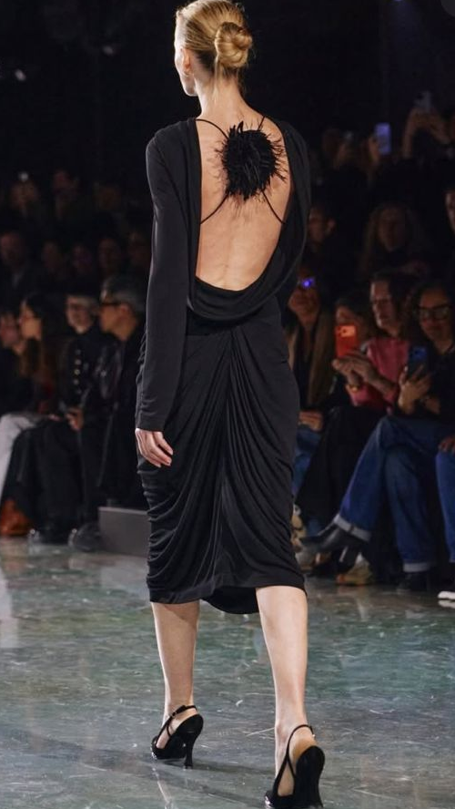 Contudo, o pretinho básico reinterpretado por Matthieu de básico nada tem. O modelito aparentemente simples revela uma camélia — símbolo da marca — nas costas nuas .