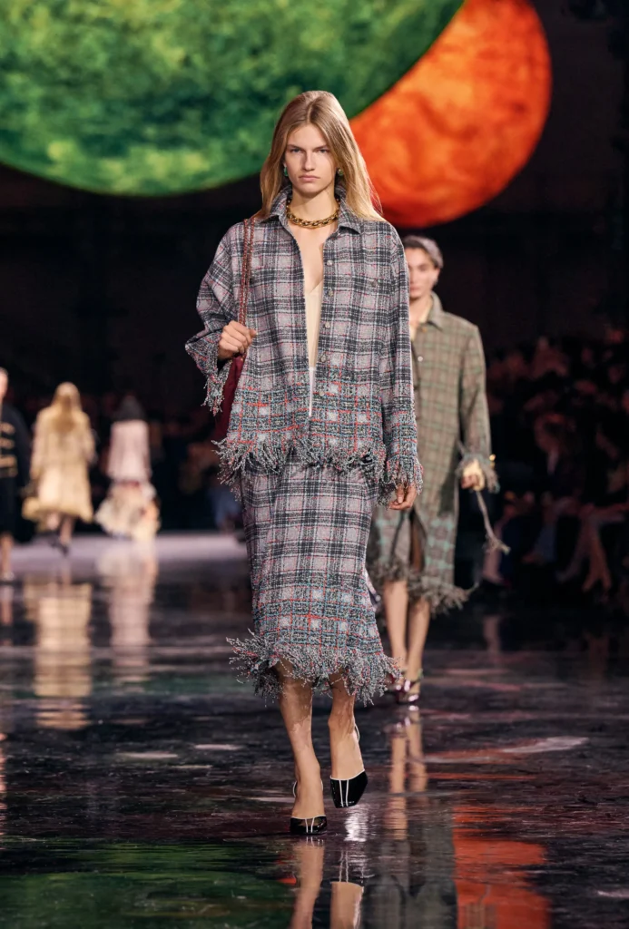 A atmosfera celestial não foi apenas cenário, mas conceito. Entre luas luminosas e astros flutuantes, Blazy propôs um diálogo entre tradição e modernidade, luz e sombra, estrutura e fluidez. “Espírito masculino-feminino, cortes soltos, tecido Pied de Poule”, anunciava a maison nas redes sociais antes do desfile, como um prenúncio do equilíbrio que guiou a coleção.