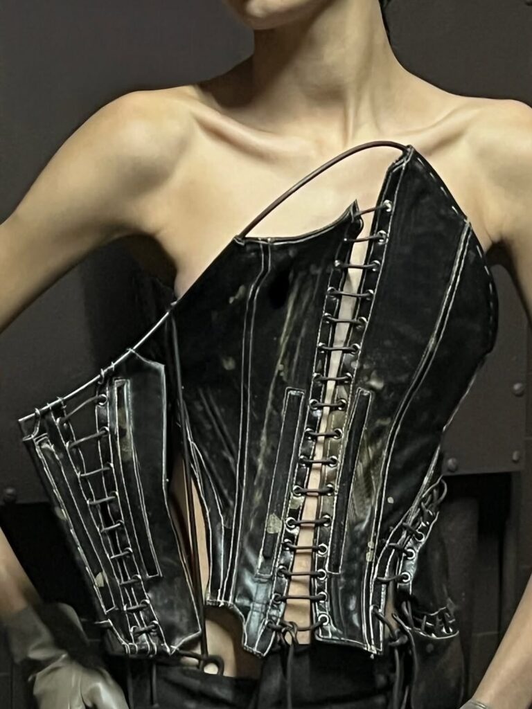 O metal aparece em algumas peças, e as cores branco, marrom, preto e cinza também estão presentes. Apesar de ser uma coleção de outono/inverno, os corpos estão descobertos e com transparências que revelam a nudez. Além do uso de corsets ou bodys, não há peças embaixo acompanhando.