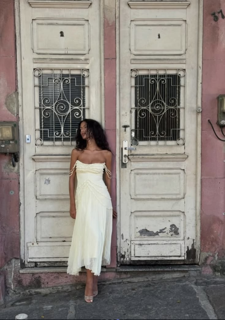 Nesse sentido, vejo uma conexão com a MPB em um sentido mais amplo, trazendo uma atmosfera suave, nostálgica e ao mesmo tempo sofisticada. Essa estética, que mistura emoção, identidade e sensibilidade, dialoga com o universo da marca e pode servir como inspiração para composições visuais e peças que explorem uma feminilidade mais fluida, delicada e expressiva.