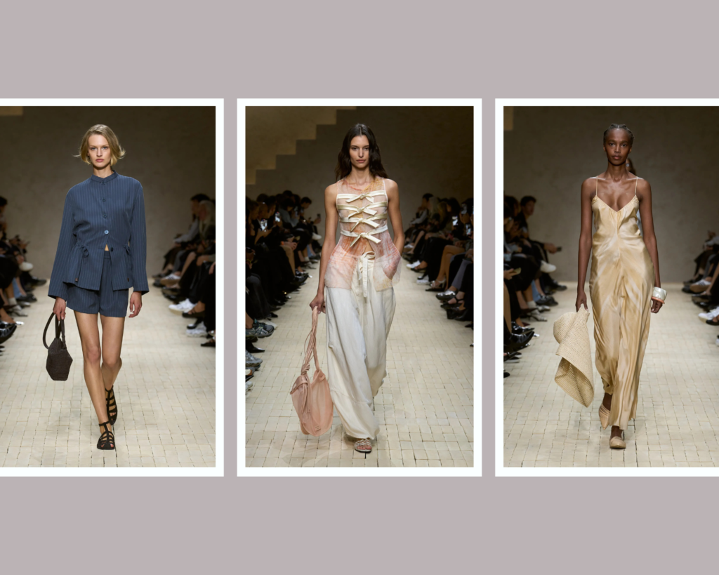 As primeiras composições surgiram em tons de cinza e off-white, com alfaiatarias de linho e adereços de cabeça em lenços e crochê. Óculos escuros arredondados e retangulares, além de bolsas maximalistas, completavam o visual. Também foi possível notar o toque lúdico de franjas, trançados e transparências, que suavizavam a seriedade dos looks.