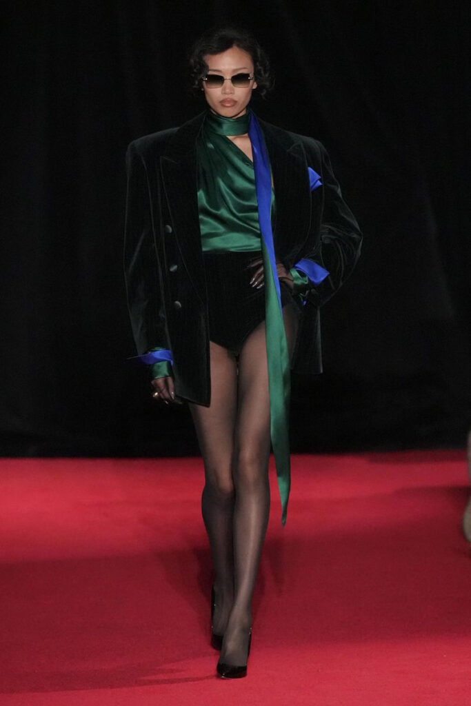 Os looks incorporaram a ideia da “vixens de Wall Street”, trazendo camisas de seda de gola alta que parecem tradicionais, mas revelam peles e transparências inesperadas, subvertendo o vestuário corporativo ao DNA da marca. a Mulher de LaQuan Smith amadureceu. Ela ainda é sexy, mas não faz questão de escancarar isso, apenas deixa transparecer.
