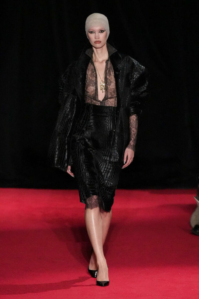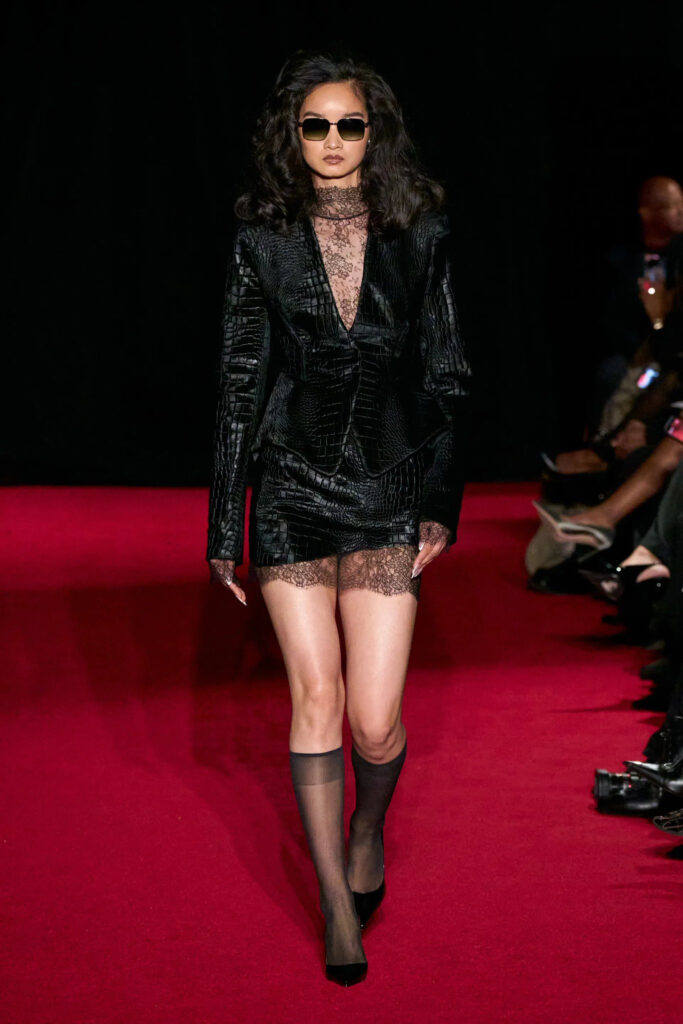 Utilizando de couros pesados com acabamento em crocodilo e camurças, estruturou sobretudos e jaquetas que parecem armaduras modernas. Em contraste, a leveza das transparências e o brilho metálico da seda trazem uma fluidez que permite movimento, reforçando que a mulher LaQuan Smith não é apenas um corpo sexy, mas uma figura ativa que domina seu redor com elegância.