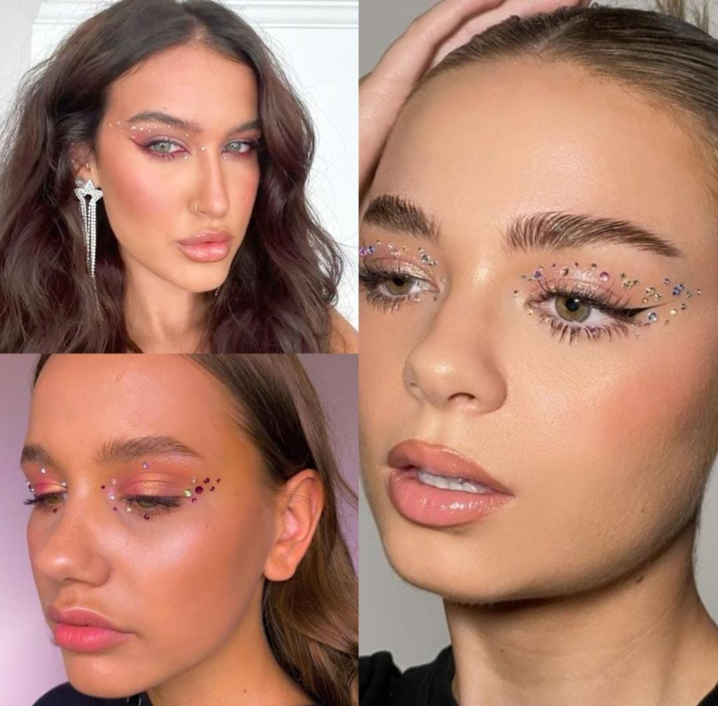 O item mais coringa desta lista são as pedrinhas de strass. Versáteis e fáceis de aplicar, elas conseguem transformar qualquer maquiagem básica em uma produção carnavalesca em segundos. Você pode aplicá-las rente aos cílios, no canto interno dos olhos ou espalhadas pela pálpebra. Para facilitar, escolha uma boa cola de cílios e utilize a ponta de um lápis ou pinça para posicionar as pedrinhas com mais precisão. O efeito é delicado, mas ao mesmo tempo ousado.
