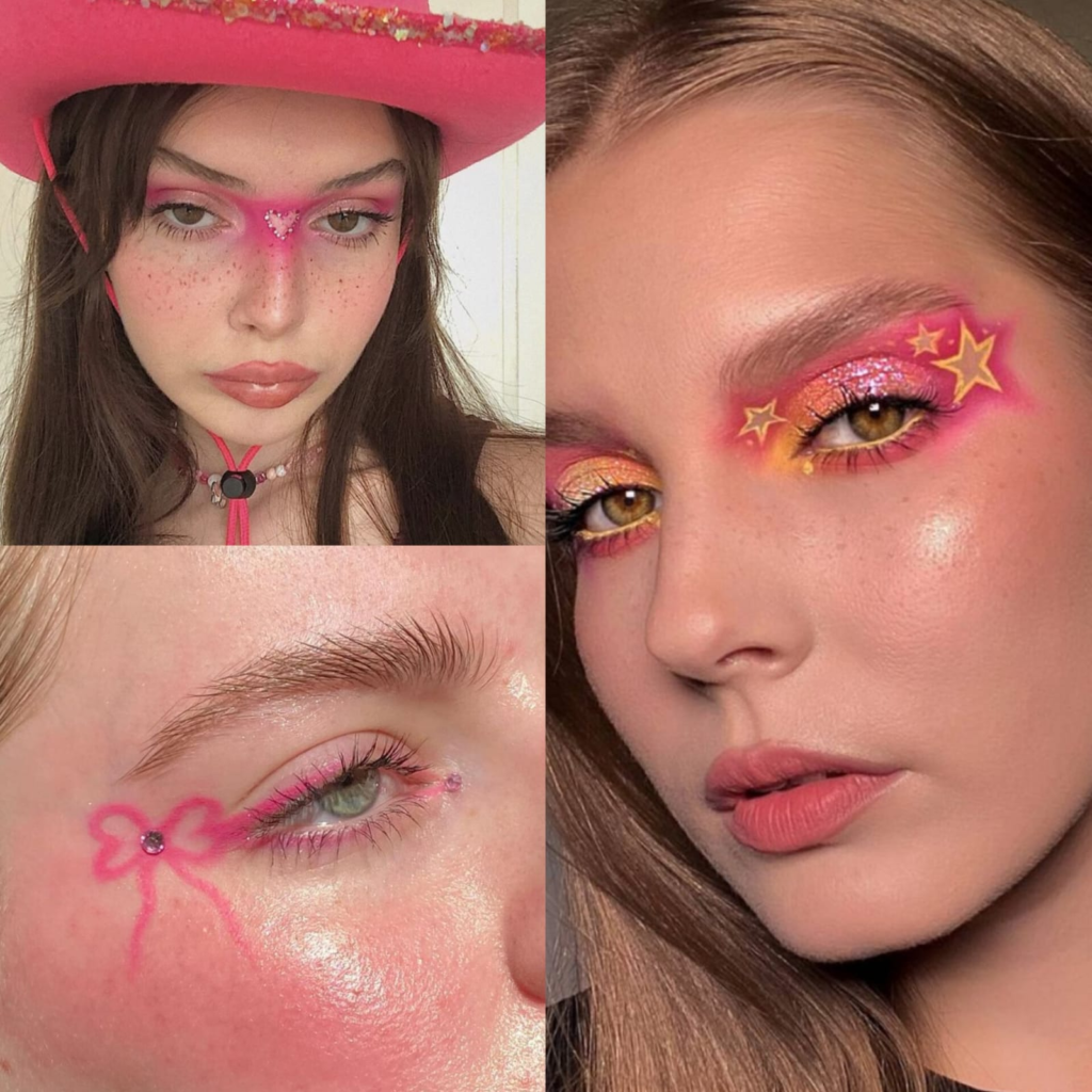 Outro viral que promete dominar o Carnaval são as formas contornadas, que dão um charme especial ao acabamento final da make. Corações, estrelas e até raios podem ser desenhados próximos aos olhos, criando um ponto de destaque no rosto. Um truque simples é recortar o formato desejado em uma fita adesiva, colar delicadamente na pele e esfumar a sombra nas laterais antes de retirar. Assim, o desenho fica mais preciso e com acabamento impecável.