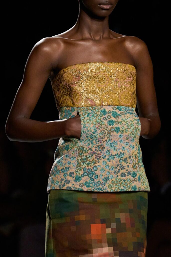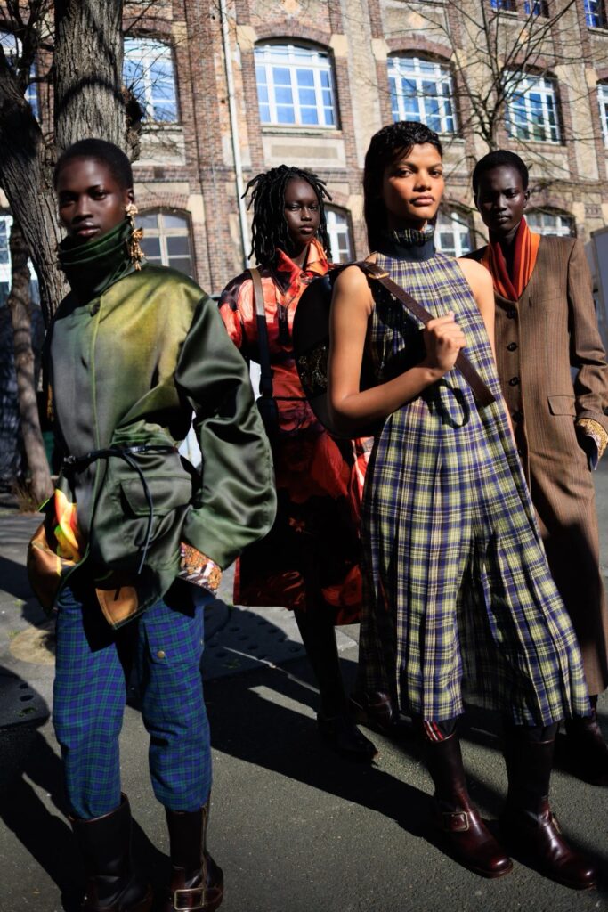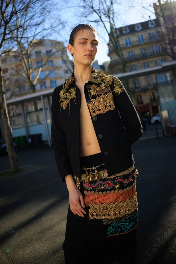 As texturas, por sua vez, reforçaram o aspecto tátil da coleção, convidando ao toque por meio de tricôs espessos, tecidos acetinados, tramas elaboradas e bordados pontuais que elevaram a experiência visual do desfile.