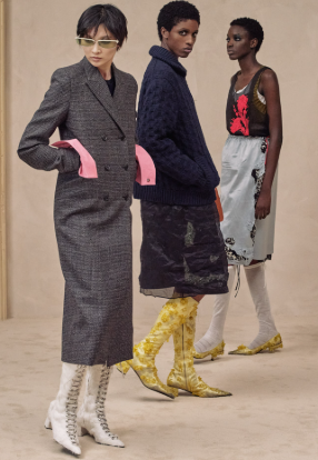 Além de provar o poder do styling, a dupla Miuccia e Raf também apostou na defesa das imperfeições no luxo. Assim, em uma crítica clara àqueles que consideram peças como descartáveis e a um mundo que estimula o consumo desenfreado, a coleção conta com roupas deliberadamente gastas.