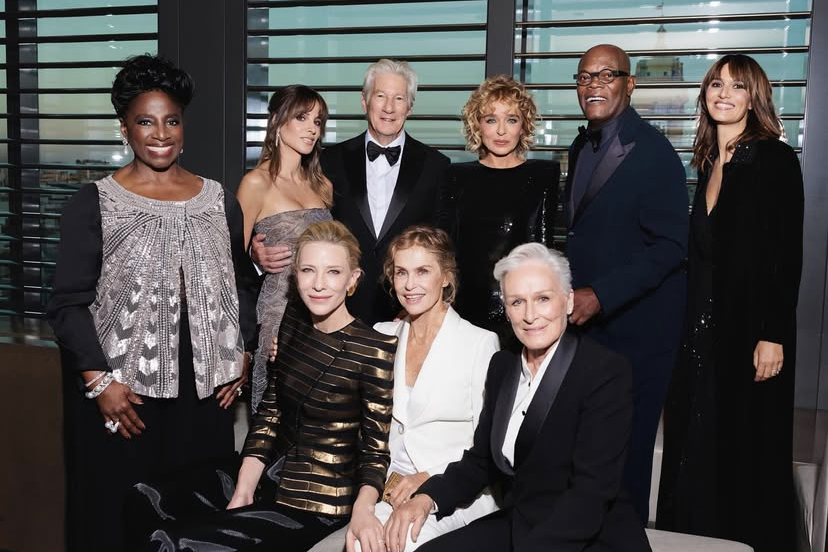 A plateia, que usava smoking e vestidos impecáveis, contou com a presença ilustre de Richard Gere na primeira fila — que eternizou Armani no cinema ao vestir a grife em “Gigolô Americano” (1980). Ao seu lado, Cate Blanchett e Glenn Close completavam o trio de ícones, confirmando que a elegância da maison permanece atemporal. Também esteve presente Spike Lee, Samuel L. Jackson e Anna Wintour, mas infelizmente a atriz Júlia Roberts não pode comparecer.