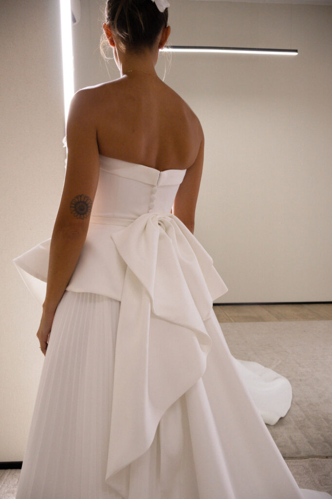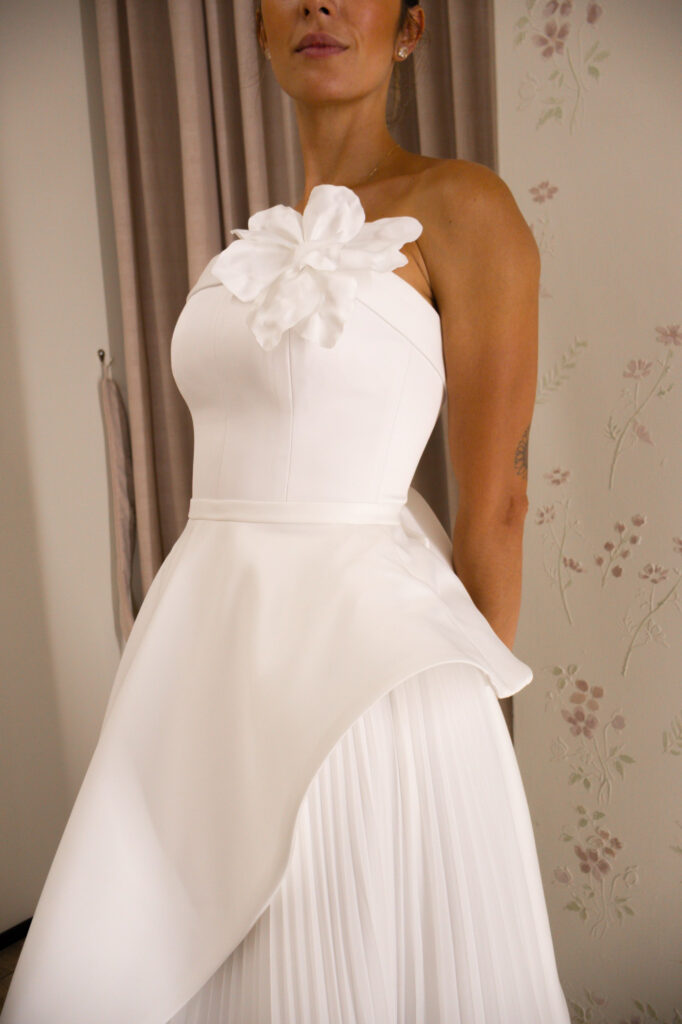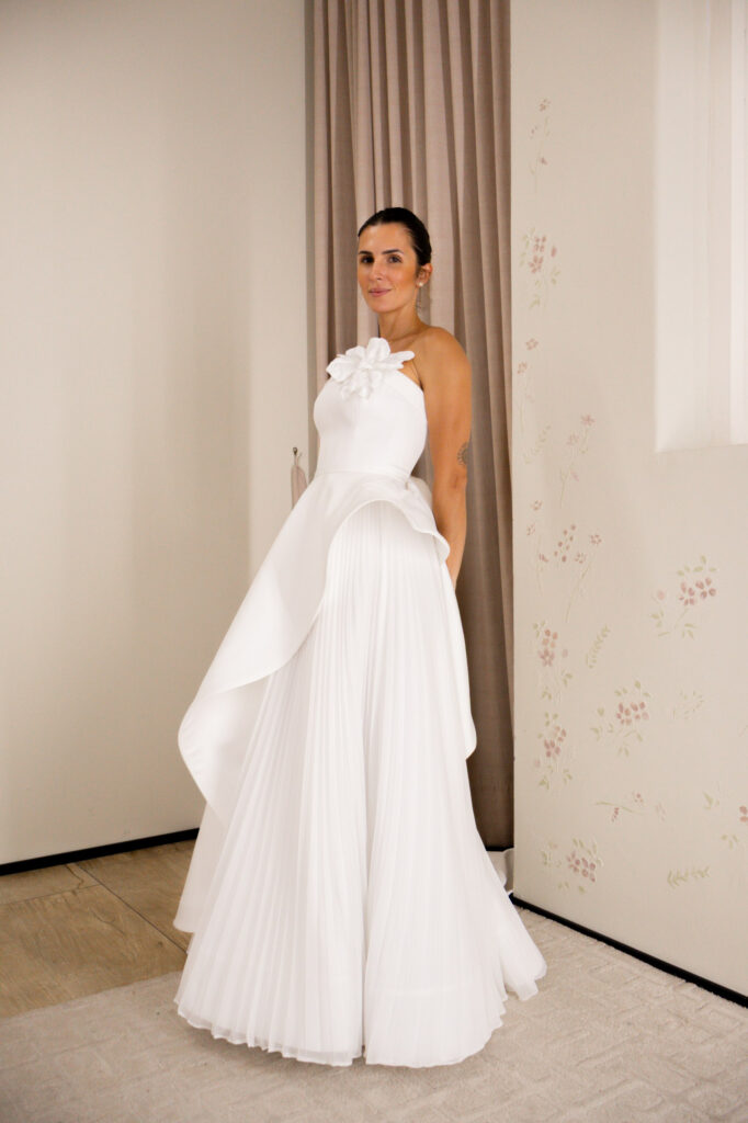 Vestido plissado com flor e véu bordado abre a temporada de noivas 2026 do Camila Paludo Atelier