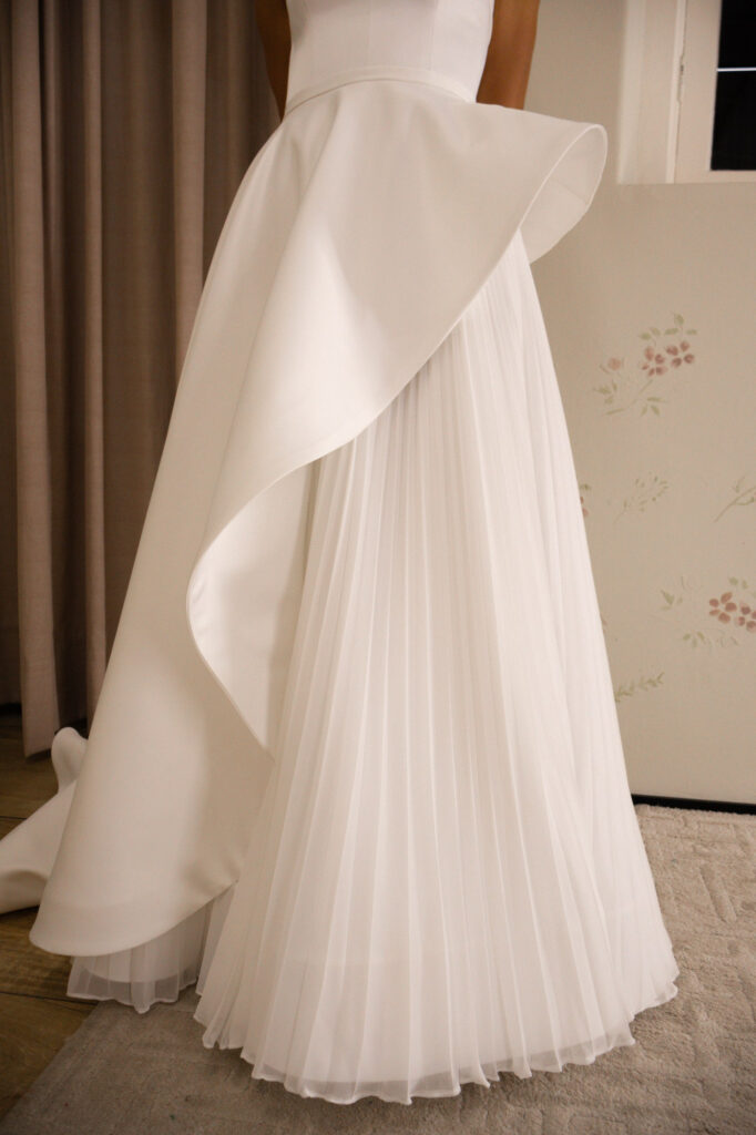 O contraste entre superfícies é um dos pontos centrais da composição. O crepe estruturado e liso do corpo cria uma base sólida e precisa, funcionando quase como um bloco arquitetônico que sustenta o desenho da silhueta. Em contraponto, o plissado da saia introduz fluidez, ritmo e movimento contínuo. As pregas verticais alongam visualmente a figura e produzem leveza dinâmica ao caminhar.