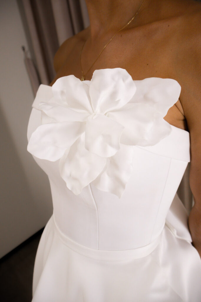 O decote tomara que caia reto reforça a proposta minimalista do vestido. A linha horizontal cria estabilidade visual e destaca ombros e colo de forma clássica e atemporal. A aplicação central da flor suaviza essa linearidade, funcionando como elemento de equilíbrio e ponto de interesse.